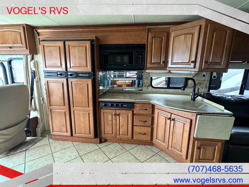 Raised-rail chassis, 350-hp Caterpillar engine, In-block engine heater, Allison MH-3000 automatic 6 speed transmission, Exhaust brake, Full air brakes with automatic slack adjusters (front and rear),Antilock brakes Freightliner chassis Powered by a Caterpillar 350 horsepower diesel and Allison automatic transmission. Clean and spacious interior featuring private rear queen bedroom with large dresser vanity and rear closet. The spacious bathroom features a hazed glass enclosed shower with sink and vanity, laundry closet with Washer/Dryer combination unit. Entertain in the living area that has newer updated furniture including tri fold sleeper sofa and recliners to relax in while watching the 40" TV. Kitchen duties won't be a problem with this appointed space that has a large residential 4 door side by side refrigerator, Convections Microwave, 3-burner stove top, beautiful Corian countertops, lots of spacious beautiful cabinetry.