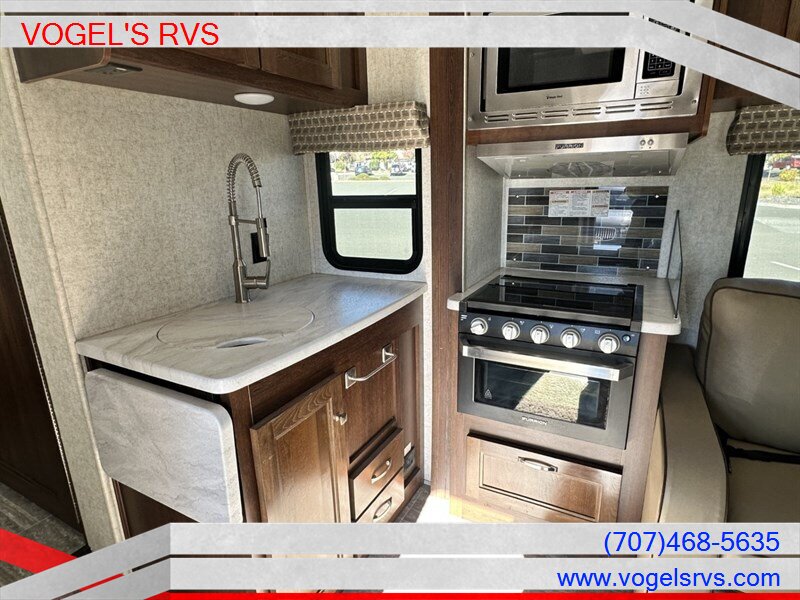 Spacious open floor plan with front cab-over queen bed, relax on your sofa with flip up footrests, sit the whole family at the spacious dinette (converts to sleeping area). The Mid kitchen has great storage including large pull-out pantry, double door refrigerator, Microwave above stove/oven, large sink, great cabinetry. Large private bathroom, that leads to rear queen walk around bed (slide out) His and Her closets with entertainment in between. Enjoy the outdoors with the outside kitchen featuring refrigerator, tv, and storage. Bring your BBQ and you are all set. Tow your boat with the 7000lbs towing capacity of your tow hitch. Easily level up your unit with the LCI Automatic hydraulic leveling system, 4000-watt generator and prepped for roof mount solar. This Sunseeker gives you a piece of mind when driving with rear and side cameras, as well as the Voyager Blindspot Detection system.