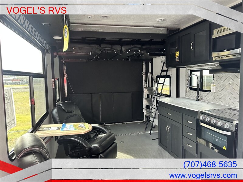A relaxing home base for weekend get aways, or family trips cross country. Anytime you want to pack up for an adventure, your Adrenaline is ready with plenty of space for all your gear, toys and the family. The galley kitchen boasts beautiful countertops, shaker style cabinets, 3 burner stove, oven an microwave. The designated master bedroom has a king size bed and bathroom access. With additional sleep space in the garage of the unit bringing the whole family won't be a problem. This Adrenaline comes equipped with a 30 gallon fuel station, perfect to keep the toys running all weekend long, 5.5K Onan generator and a patio kit for additional outdoor living space. Weather it's a weekend away for 2 or a long summer adventure for the whole family, the Adrenaline 27KB is the way to do it. What are you waiting for, GET CAMPING!