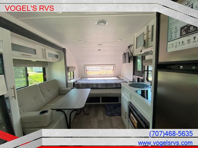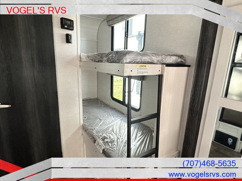 As you step through your entry door and look to your right you will find a large curved front picture window sitting above your 60 X 74 queen murphy bed. To your left is the kitchen featuring a 10-cu. ft double door stainless steel front refrigerator/freezer, 2 burner stove, large, barreled sink, undermounted microwave convection oven and pantry. Across from the kitchen is your slide out, holding your jack knife sofa that opens into an additional sleeping space. The rear of your unit is your standard bathroom with shower and medicine cabinet. To the right of the bathroom are your 26 X 74 bunk beds. Outside you'll find an electric awning with LED strip lighting, as well as an outdoor griddle making spending time outdoors easier. Dry camping is no problem with your on-board solar panel, and 1000-watt Inverter. It’s everything you need for a long weekend away or a summer spent traveling. What are you waiting for, grab the family and go camping!