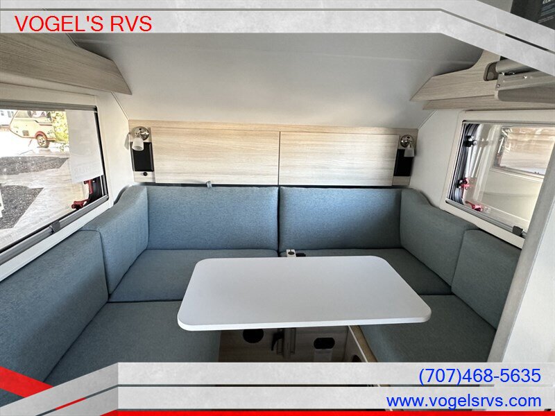 This Teardrop Camper has everything you need to make your camping experience even more enjoyable. The TAB features a U-shaped dinette that converts into a comfortable sleeping area with multiple configuration options. The split cushions allow the dinette to be made into an RV queen-sized bed or a twin bed, with the other half remaining in a seated position. With the TAB, there’s no reason to leave the campground for a delicious meal. The galley kitchen has all the necessary equipment, including a stainless-steel sink, a 2-burner glass-top stove, and a 12v refrigerator. The central air conditioning and hydronic heating system will keep you cool in the summer and warm during the cooler months. The Alde® heating system is silent and effective, keeping you warm and allowing you to enjoy a nice hot shower in the TAB wet bath, including a sink and a cassette toilet.