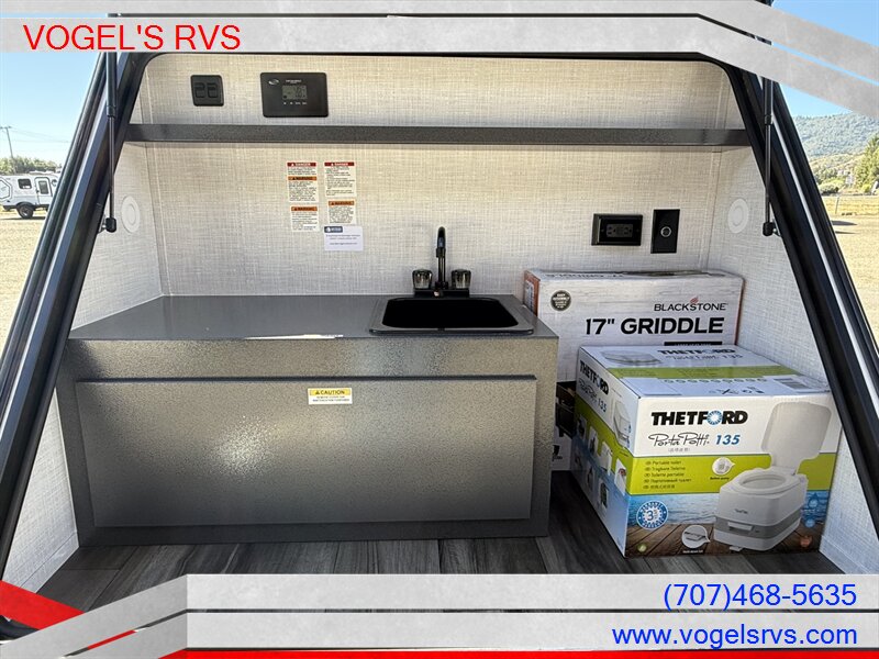 Outdoor Kitchenette: Includes a 17" Blackstone Griddle, Sink with a 26-gallon fresh water tank, 12V water pump, and Port-A-Potty.