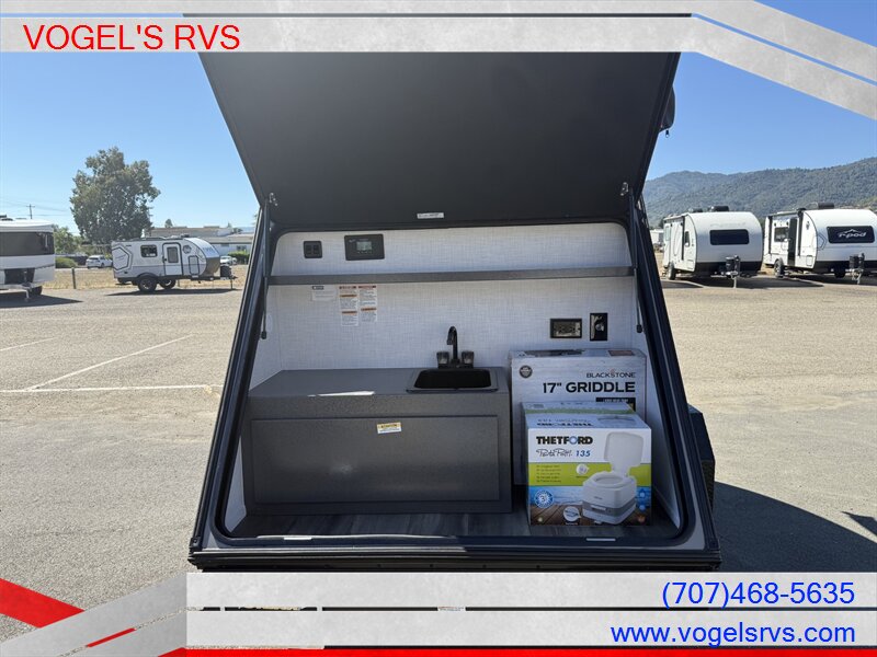 This is the perfect trailer for two campers looking for adventure. The dual entry doors will make it so easy for you both to climb into bed each night, and there is an overhead cabinet to keep your valuables out of the way. The A/C will keep you cool on those hot summer camping months, furnace for the cold months. An outside kitchen includes a 17" Blackstone Griddle, a sink.